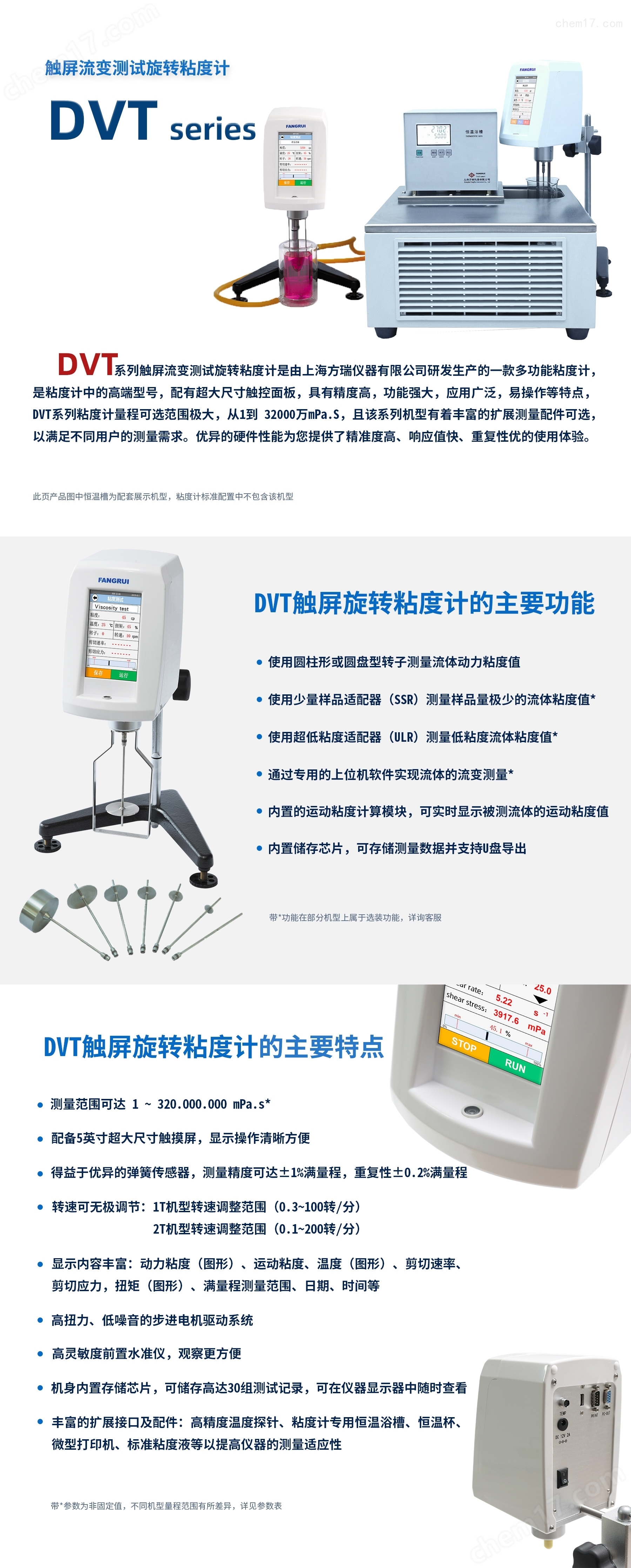 可从0.3到100转 或 0.1到200转无级调速; 粘度计显示的参数非常多:粘度、温度、剪切速率剪切应力、时间、运动粘度等。